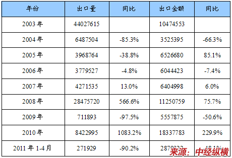 2003-2011年4月我国墙布(壁布)出口数量及金额统计