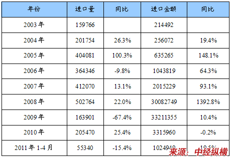 2003-2011年4月我国墙布(壁布)进口数量及金额统计