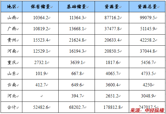 我国铝土矿资源主要为一水硬铝石型铝土矿,属于高铝高硅低铁难溶矿石,铝硅比偏低,冶炼成本相对较高,主要分布在河南、山西、广西、贵州等地,占全国储量的93.8%。据估计,按照现有铝工业发展速度静态计算,我国现有铝土矿资源储备将只能用10年。