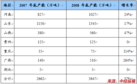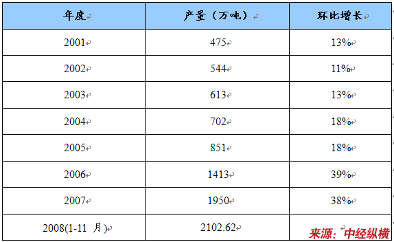 2008年1-11月,我国氧化铝产量达到2102.62万吨,较上年增加18.2%。产能方面,截至2008年底,我国氧化铝产能有望达到3647万吨。