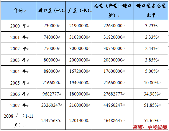 2008年1-11月中国铝土矿产量2201万吨,约占全球17879万吨的12%,大大低于我国原铝产量占全球32%的比率。2008年1-11月我国进口铝土矿达到2447万吨,约占我国总需求量的52.65%。
