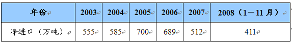 尽管我国氧化铝产量快速增加,但依然满足不了我国电解铝 行业 的飞速发展,我国氧化铝依旧处于净进口的状态。2008年1-11月,我国氧化铝净进口411万吨,较07年同期减少近64万吨,其主要原因是伴随着我国氧化铝产能的急剧扩张,铝土矿的进口开始逐渐替代氧化铝的进口。