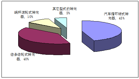 在世界范围内,汽车循环球式转向器占45%左右,齿条齿轮式转向器占40%左右,蜗杆滚轮式转向器占10%左右,其它型式的转向器占5%。