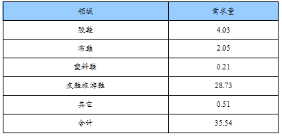 胶鞋分全胶鞋和布面胶鞋,胶鞋所用的胶粘剂主要是乳胶和汽油胶。从用途上看最大用量是合布胶,以往全布胶主要用汽油胶,出于环保、安全及价格成本的原因,后来多用乳胶作为合布胶。不少厂家为了降低成本在其中加入一定量的淀粉胶、树脂乳液等,但总体上仍属乳胶范畴。乳胶还用于布胶鞋围条粘合工序,全胶鞋围条的粘合通常使用汽油胶。一些胶鞋厂在生产布胶鞋时也有使用汽油胶粘围条和其它部件的做法。