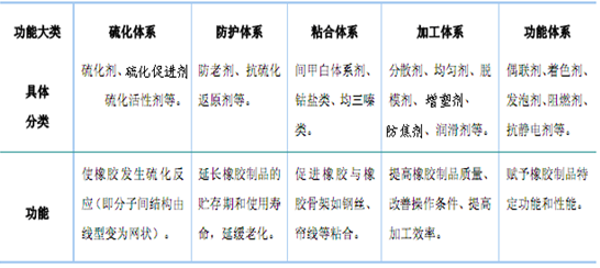 按照橡胶助剂的功能划分,橡胶助剂的具体分类见下表: