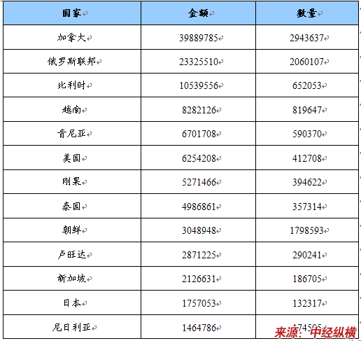 2007年钨钼矿分国别出口情况 单位:美元、公斤