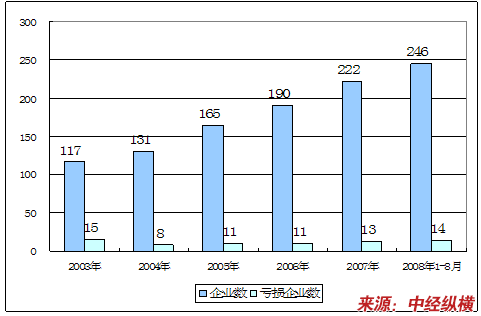 一、2003-2008年1-8月中国钨钼矿采选 行业 企业及亏损企业数量