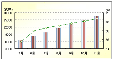 1-11月份,全国规模以上工业企业(全部国有工业企业和年产品销售收入500万元以上的非国有工业企业,下同)实现利润16532亿元,比去年同期增长30.7%。工业经济效益综合指数188.41,比去年同期提高17.43点。
