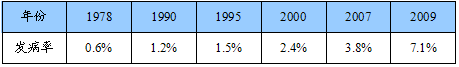 我国糖尿病的发病率在过去几年也在持续增高,根据《2009中国卫生统计年鉴》的统计数据,2008年我国调查地区居民糖尿病两周患病率高达6.0‰,这个数字在2003年才2.2‰,1998年仅有1.2‰,增速呈现了逐渐增大。