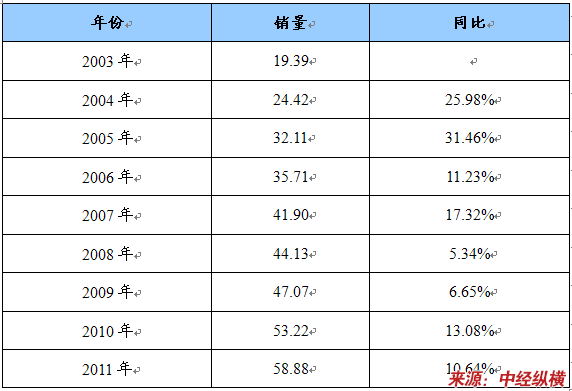 2003-2011年我国软排线(FFC)销量统计 单位:亿条