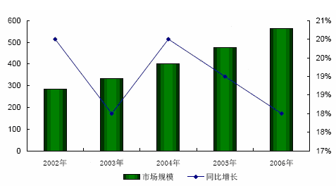 2004年,中国的内衣市场容量已超过400亿元,且每年以近20%的速度增长。尽管这几年我国内衣市场不断发展壮大,但仍处于起步阶段,发展潜力很大,2005年中国内衣市场规模已达477亿元,预计2006年这一数将突破500亿,达到560亿以上。
