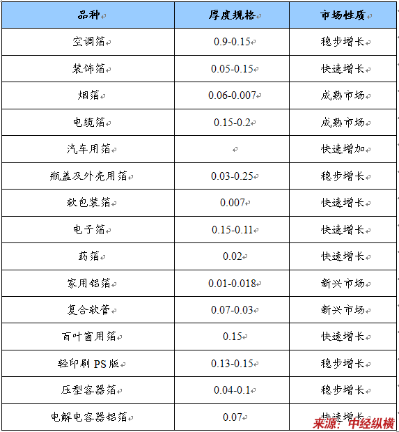 空调箔是制造空调器用热交换器翅片的专用材料;其次是烟箔:我国是世界最大的卷烟生产和消费国,目前有132家大型卷烟厂,年产卷烟3400万大箱,基本都采用香烟箔包装,其中70%采用压延铝箔,年消耗量达3.5万吨,占到双零箔总量的70%;三是装饰箔:目前我国建筑、家装 行业 已形成装饰箔的应用热潮,另外采用装饰箔包装礼品在国外非常盛行,近几年在我国的发展速度很快,也会有较好的前景;四是电缆箔,利用铝箔的密闭性和屏蔽性,用作线缆的护罩。以上4个品种的需求量占总需求量的70%以上。药箔应用比例也不断提高,在国际医药 行业 PTP铝箔应用非常广泛。汽车用箔、软包装用箔和电子箔等需求量不大,但市场成长性好,已成为铝箔市场重要的增长点。
