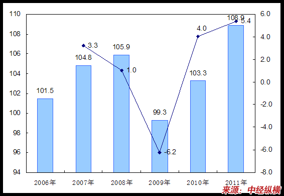 如果2012年欧美债务危机在一定程度上得到控制,主要发达经济体整体不出现二次衰退,发展中经济体通胀压力得到一定缓解,世界经济继续保持低速增长态势。同时,我国把“调结构”作为宏观调控的首要任务。继续实行积极的财政政策和稳健的货币政策,财政政策的扩张力度有所减弱,财政赤字率略有下降;货币政策则主要加大对表外业务的控制力度,使社会融资总量增长进入真正稳健状态。在这一国际环境和政策假设情景下,经模型测算,我国经济可望在结构调整中保持平稳较快增长态势,GDP增长8。7%左右;且经过精心调控,妥善应对输入性通货膨胀压力,可以将居民消费价格上涨幅度控制在4%左右。