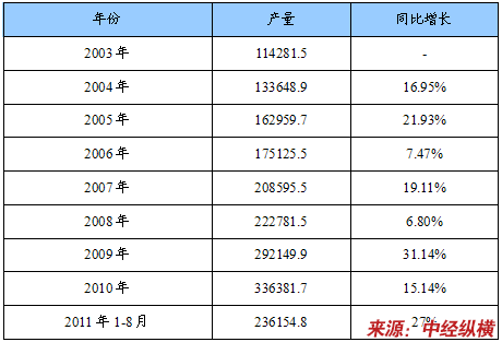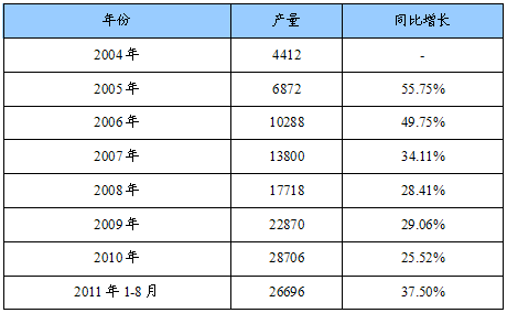 2004-2011年中国燃气高速调温烧嘴产量及同比增长