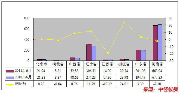 一、2011年国内燃气高速调温烧嘴产销量对比