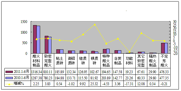 1-6月份,全国耐火材料产量1316.3万吨,同比增长2.25%;其中致密定型耐火制品810.11万吨,同比增长3.83%;不定形耐火制品476.33万吨,同比增长-0.21%。主要品种产量见图。