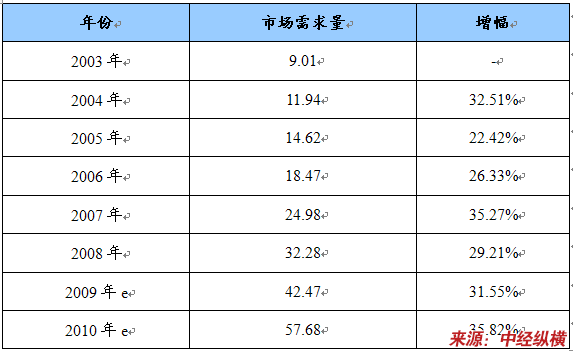 2003—2010年紫杉醇类制剂产品市场规模及预测表 单位:亿元