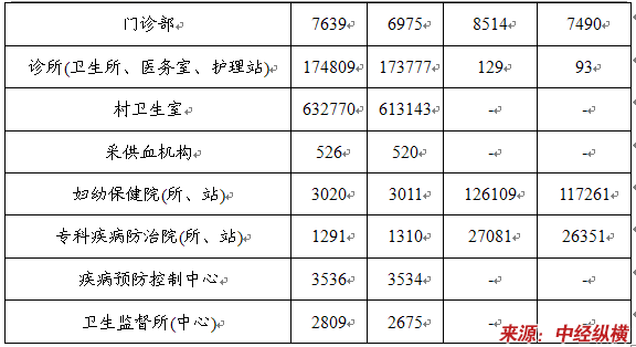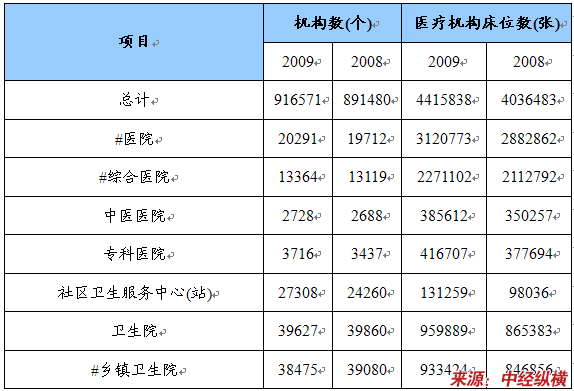 2009年末,全国注册医疗机构90.7万个,其中:医院20291个,社区卫生服务中心(站)2.7万个,乡镇卫生院3.8万个,诊所(卫生所、医务室)17.5万个,村卫生室63.3万个。与上年比较,除乡镇卫生院减少605个(乡镇撤并和乡镇卫生院合并所致),其他医疗机构增加。