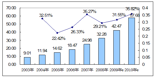 2003—2010年紫杉醇类制剂产品市场规模及预测图 单位:亿元