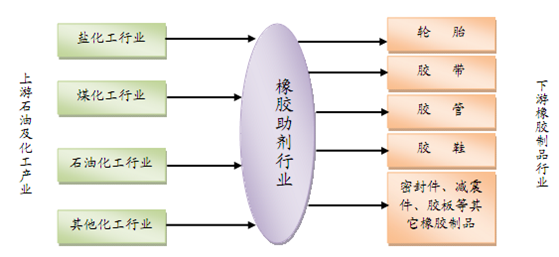 橡胶助剂产品上游原料主要是各类石油化工产品及相关化学中间体;下游市场主要面向各类橡胶制品生产企业,用于制造轮胎、橡胶软管、橡胶带、橡胶薄片和橡胶鞋底等,特别是轮胎和汽车用橡胶制品需求量最大。