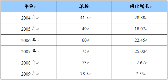 2004-2009年我国苯胺产量及增长情况 单位:万吨,%
