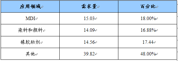 上游主要原材料(苯胺)应用领域需求量统计表 单位:万吨