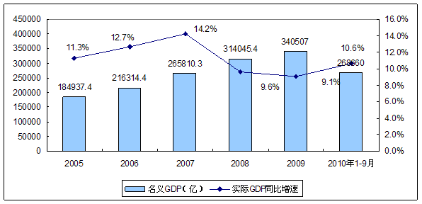 2005年-2010年3季度我国GDP增长变化图