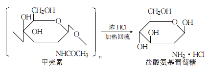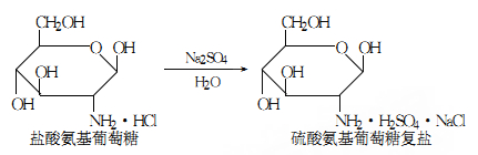 目前,工艺路线有酶法水解和化学水解两种。生产技术的原理是以甲壳素(N-乙酰氨基-2-脱氧-β-D-葡萄糖聚合物)为原料,经浓盐酸水解作用,使糖苷键断裂,酰胺键水解生成D-氨基葡萄糖盐酸盐,在和硫酸钠反应得到硫酸氨基葡萄糖复盐。