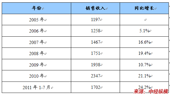 2005-2011年7月化学药品原药销售收入增长统计表 单位:亿元