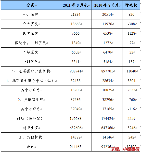 与2010年8月底比较,全国医疗卫生机构增加12102个,其中:医院增加820个,基层医疗卫生机构增加11040个。基层医疗卫生机构中:社区卫生服务中心(站)增加3804个,乡镇卫生院减少760个,村卫生室增加5246个,诊所(医务室)增加2259个。