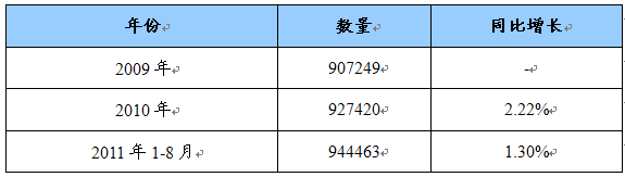 2009-2011年8月医疗卫生机构数增长情况统计表 单位:个