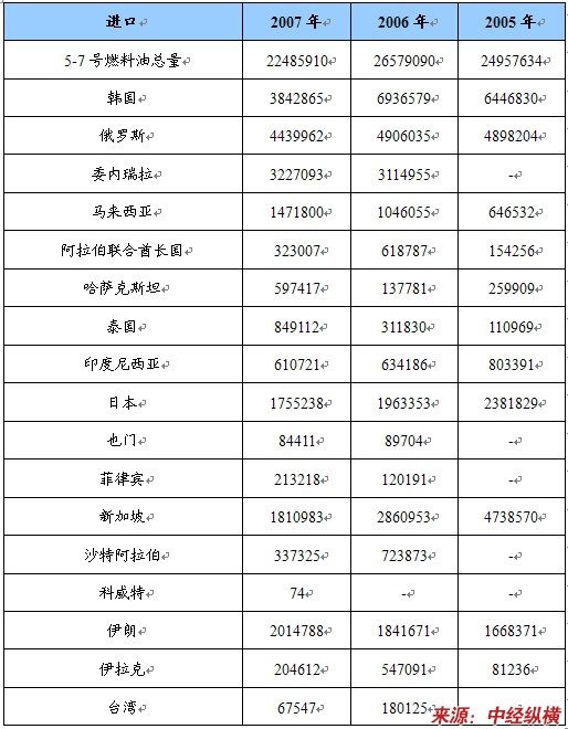 在我国燃料油市场中,广东省占据非常重要的地位。广东省是全国燃料油需求量最大的省份,近几年全省的燃料油需求均保持在1000万吨/年以上的水平,占全国燃料油总需求量的1/4到1/3.在进口方面,历年广东省的燃料油进口占全国进口量的比例在50-80%之间,进口燃料油是广东市场供应的主要渠道。据海关统计,广东口岸共进口燃料油1572.3万吨(含奥里乳化油),价值29亿美元,分别比上年同期增长20.2%和39.6%。燃料油进口量、值分别占广东口岸成品油进口量、值的96.4%和91.9%。广东燃料油进口主要以一般贸易方式为主,进口1385.5万吨,同比增长15%,占进口总量的88.1%;进入保税仓库的燃料油有152.8万吨,增长68.9%。受国际市场原油价格上升的影响,燃料油价格也随之上涨。广东口岸进口燃料油的平均价格为184美元/吨,比上一年的159美元/吨价格上涨了16.1%。燃料油进口主要产地为新加坡、韩国和俄罗斯。广东口岸分别自新加坡、韩国进口燃料油462.5万吨、321.8万吨,分别增长33.8%、7.3%;从俄罗斯进口255.1万吨,下降18.4%,自上述国家的进口量合计为1039.4万吨,占进口总量的66.1%。