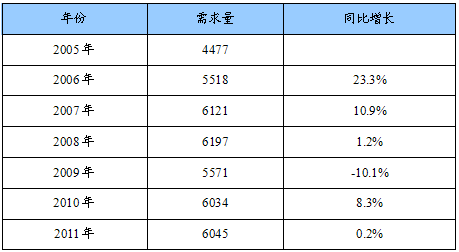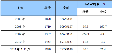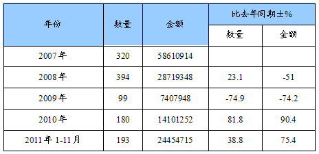 2007-2011年我国液体介质变压器,650kVA<额定容量≤10MVA进口统计