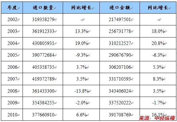 2002-2010年中国未涂布印刷用纸及书写用纸进口数量及金额统计 单位:千克,美元