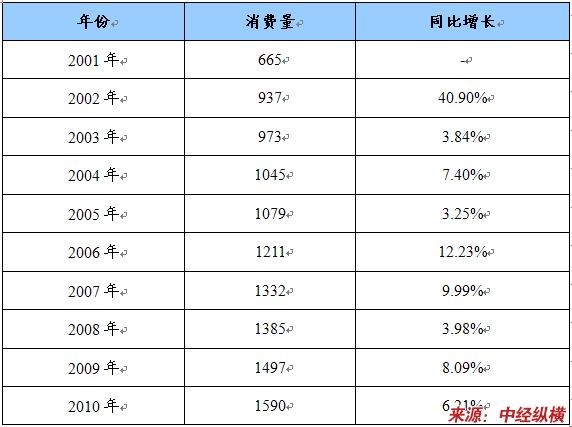 2001-2010年中国未涂布印刷用纸及书写用纸消费量变化 单位:万吨