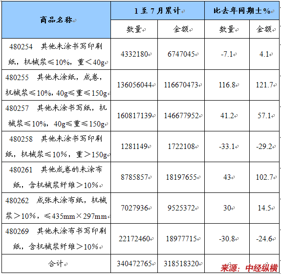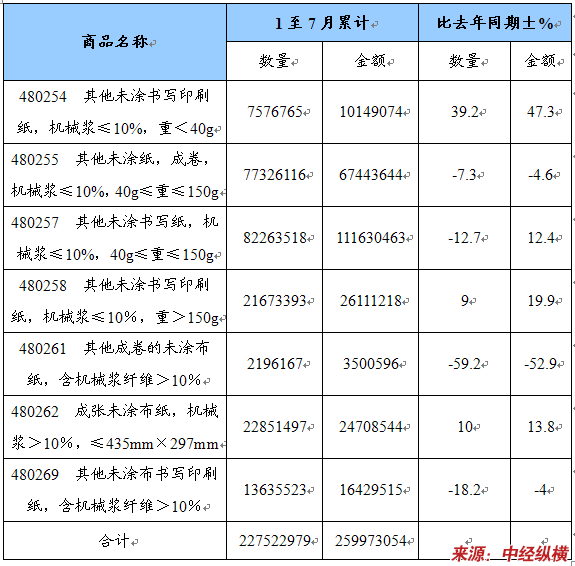 国家统计局统计数据:2011年7月,我国规模以上企业未涂布书写纸产量77.26万吨,环比上升1.06%,同比上升14.30%;2011年1-7月累计产量509.04万吨,同比下降2.78%。
