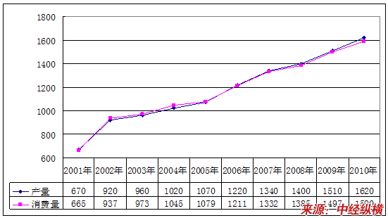 2001-2010年中国未涂布印刷用纸及书写用纸产量、消费量对比图 单位:万吨