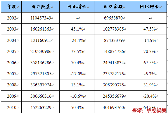 2002-2010年中国未涂布印刷用纸及书写用纸出口数量及金额统计 单位:千克,美元
