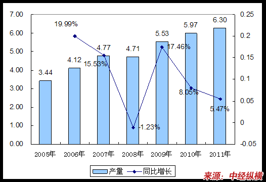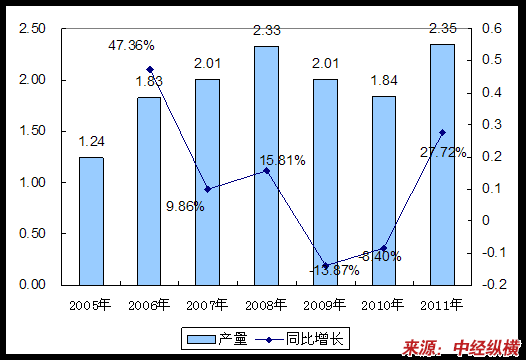 2011年,我国生铁日产量为172.5万吨,粗钢日产量为187.2万吨,钢材日产量为233.7万吨,同比分别增加10.8万吨、15.4万吨和15.1万吨,增幅分别为6.7%、9.0%和6.9%。