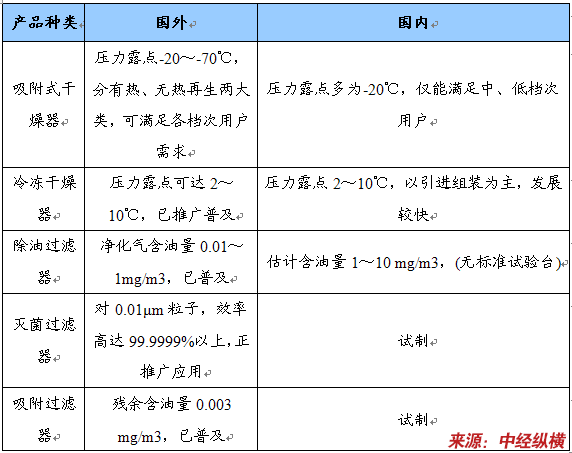 国内压缩空气净化技术及产品性能和普及程度与国外相比,落后10~20年。国外六十年代吸附式干燥器发展成熟;七十年代中后期,高效过滤器取明显进步;八十年代冷冻式干燥器到普及,超滤技术发展引人注目。国内从七十年代末开始仿制吸附式干燥器;八十年代末开始仿制高效过滤器;冷冻干燥器近几年刚开始起步。