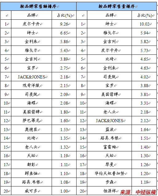 从统计资料看,服装类商品零售额排前十名的基本以国内品牌为主,国际品牌不是主流。香港品牌主要集中在男西服、男衬衫,还需进一步拓展其市场空间。