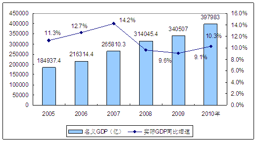 由上图可知,近年来我国国内生产总值(GDP)一直保持高速增长,增长幅度均超过了9%。虽然受世界性经济危机的影响,我国2008和2009年的GDP增长幅度有所下降,但2010年的经济增长幅度出现回升。