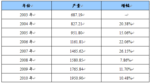 2003-2010年我国汽车转向器产品产量统计及预测 单位:万套