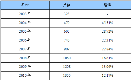 2003-2010年中国N4-乙酰胞嘧啶核苷产值及同比增长