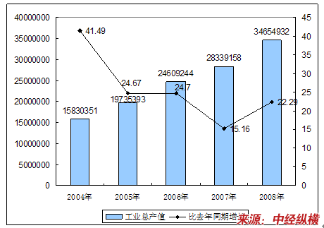 2004-2008年工业销售产值增长变化趋势图 单位:千元、%