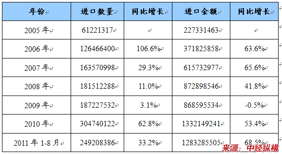一、2005-2011年1-8月国产品牌葡萄酒进口 分析