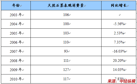 2003-2010年中国天然石墨表观消费量及同比增长 单位:万吨
