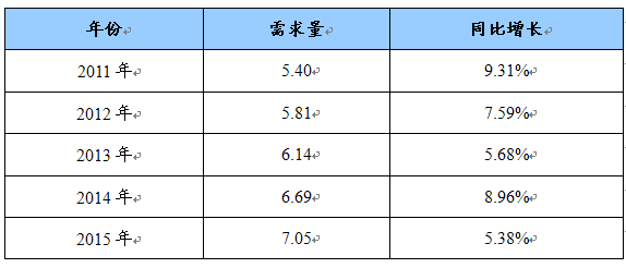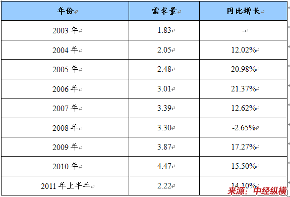 2003-2011年上半年开口剂需求量及同比增长统计表 单位:万吨