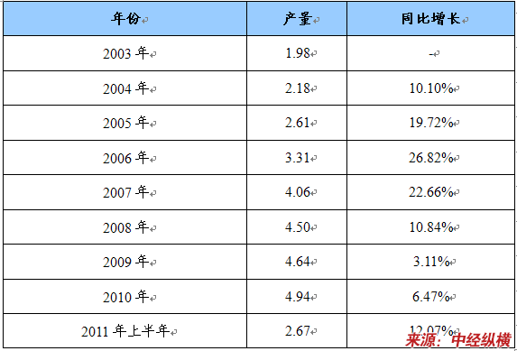 2003-2011年上半年开口剂产量及同比增长统计表 单位:万吨
