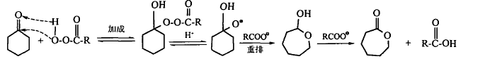 首先,过氧酸向环己酮的羰基上进行亲核加成生成过渡中间产物;其次,中间产物的过氧键异裂成正氧离子;然后,烃基从碳原子上转移到氧原子上并进行重排,生成质子化的内酯和羧酸根负离子;最后,生成内酯和羧酸.由于环己酮的羰基两边结构对称,所以生成的内酯是唯一的。